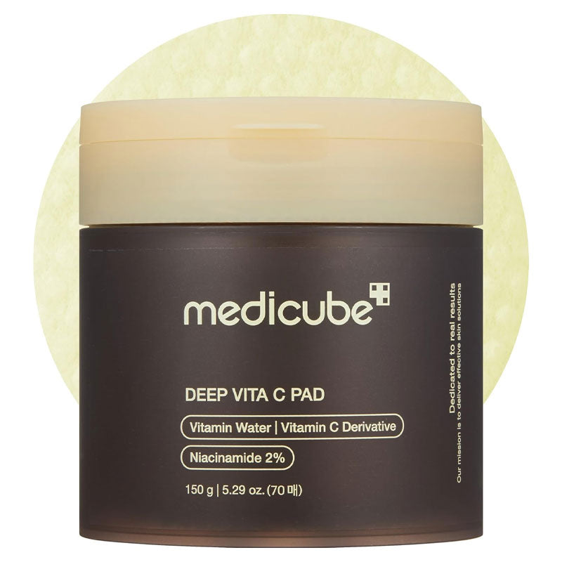 The Medicube Deep Vita C Pad is a vegan toner pad infused with Vitamin C, sea buckthorn extract, niacinamide, and lemon peel extract to brighten skin, fade dark spots, and smooth texture.