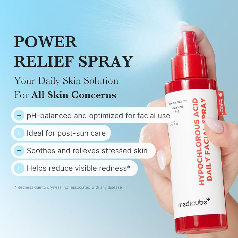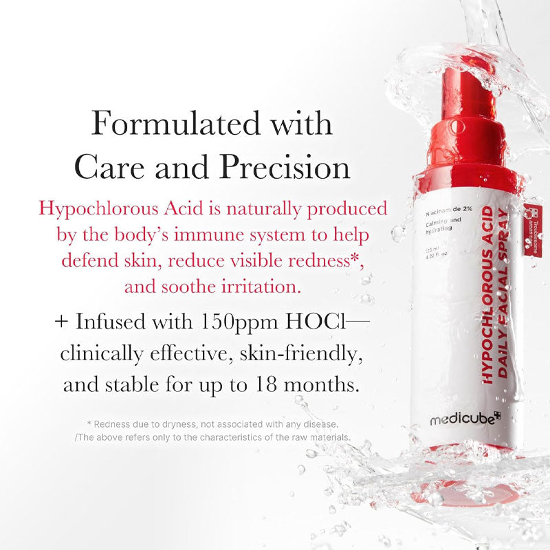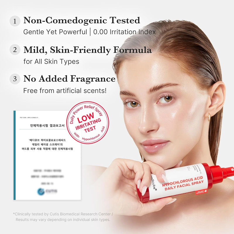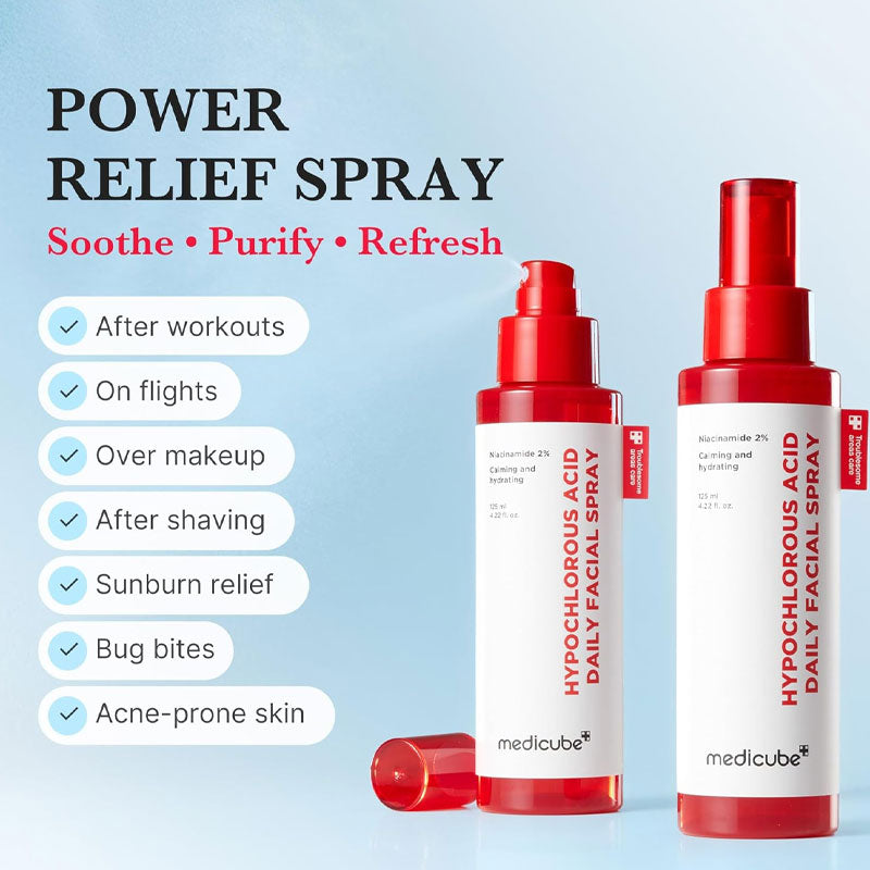 The Medicube Hypochlorous Acid Daily Facial Spray is a pH-balanced mist formulated with 150ppm HOCl to soothe irritation, reduce acne-causing bacteria, and refresh stressed skin at any time.