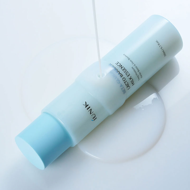 iUNIK Beta-Glucan Lacto Barrier Milk Essence is a hydrating Korean essence formulated with 68% Lactobacillus Ferment Lysate, beta-glucan and peptides to strengthen the skin barrier and boost moisture.