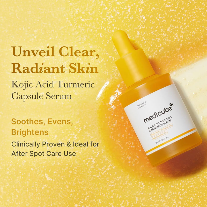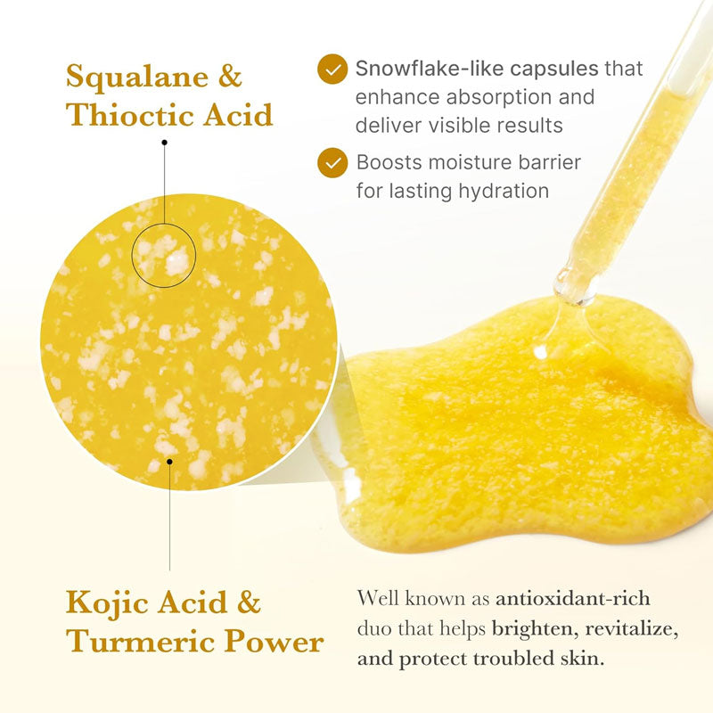 The serum features Kojic Acid to fade dark spots, Turmeric to soothe irritation, Niacinamide and Vitamin E to refine texture, and micro-capsules with Squalane and Thioctic Acid for deep hydration.