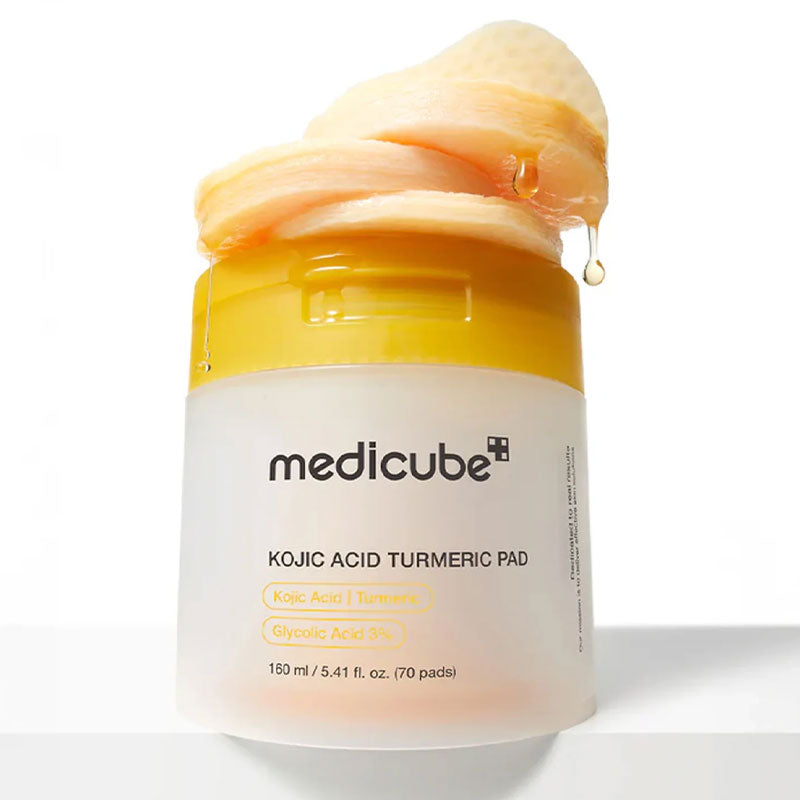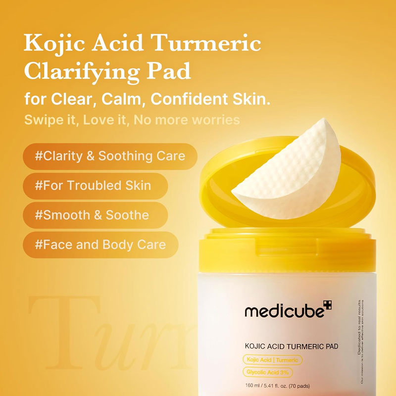 The Medicube Kojic Acid Turmeric Pad is designed to brighten dull skin, fade dark spots, refine pores, and calm irritation for a smoother, more even complexion.